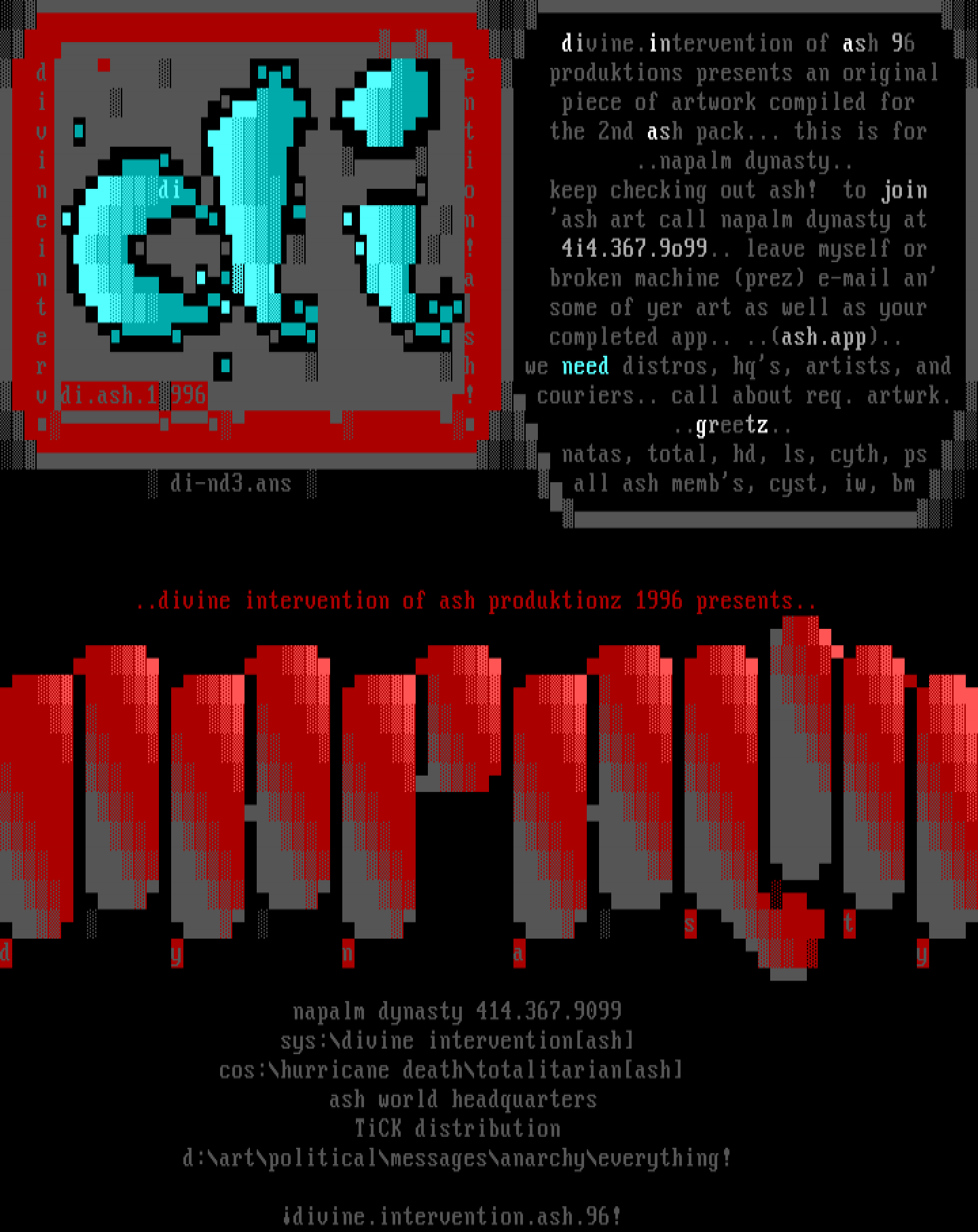 divine.intervention of ash 96 d e produktions presents an original i n piece of artwork compiled for v t the 2nd ash pack... this is for i i ..napalm dynasty.. ndio keep checking out ash! to join e n ash art call napalm dynasty at i! 4i4.367.9o99.. leave myself or n a broken machine prez e-mail an t some of yer art as well as your es completed app.. ..ash.app.. rh we need distros, hqs, artists, and vdi.ash.1996! couriers.. call about req. artwrk. ..greetz.. natas, total, hd, ls, cyth, ps di-nd3.ans all ash membs, cyst, iw, bm