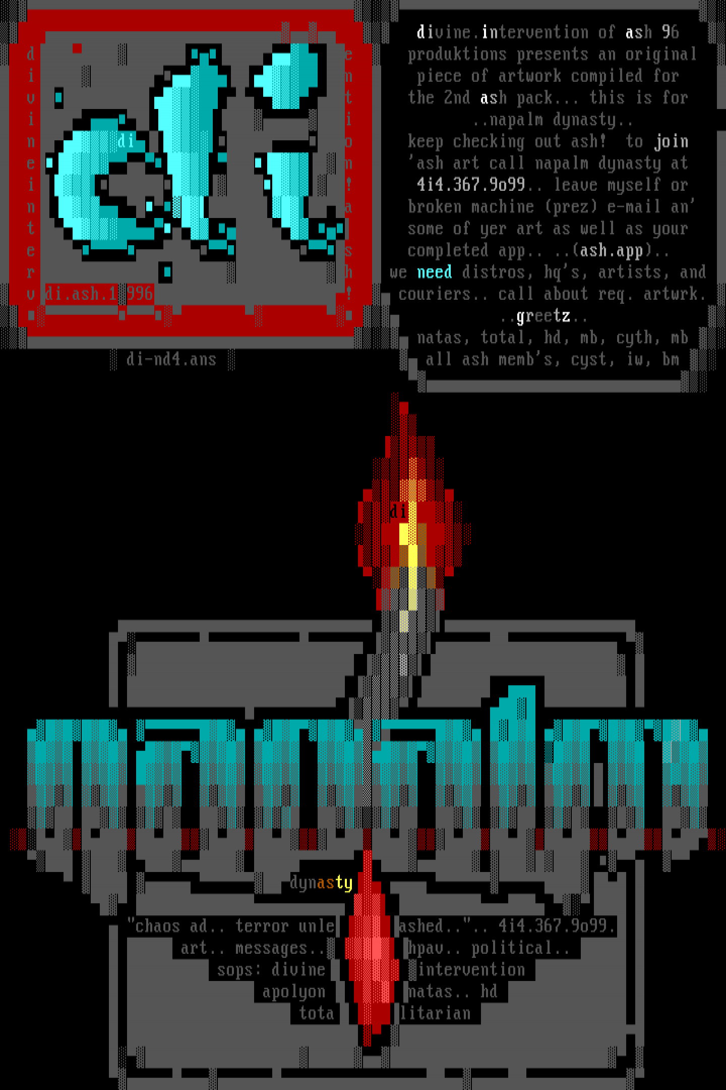 divine.intervention of ash 96 d e produktions presents an original i n piece of artwork compiled for v t the 2nd ash pack... this is for i i ..napalm dynasty..