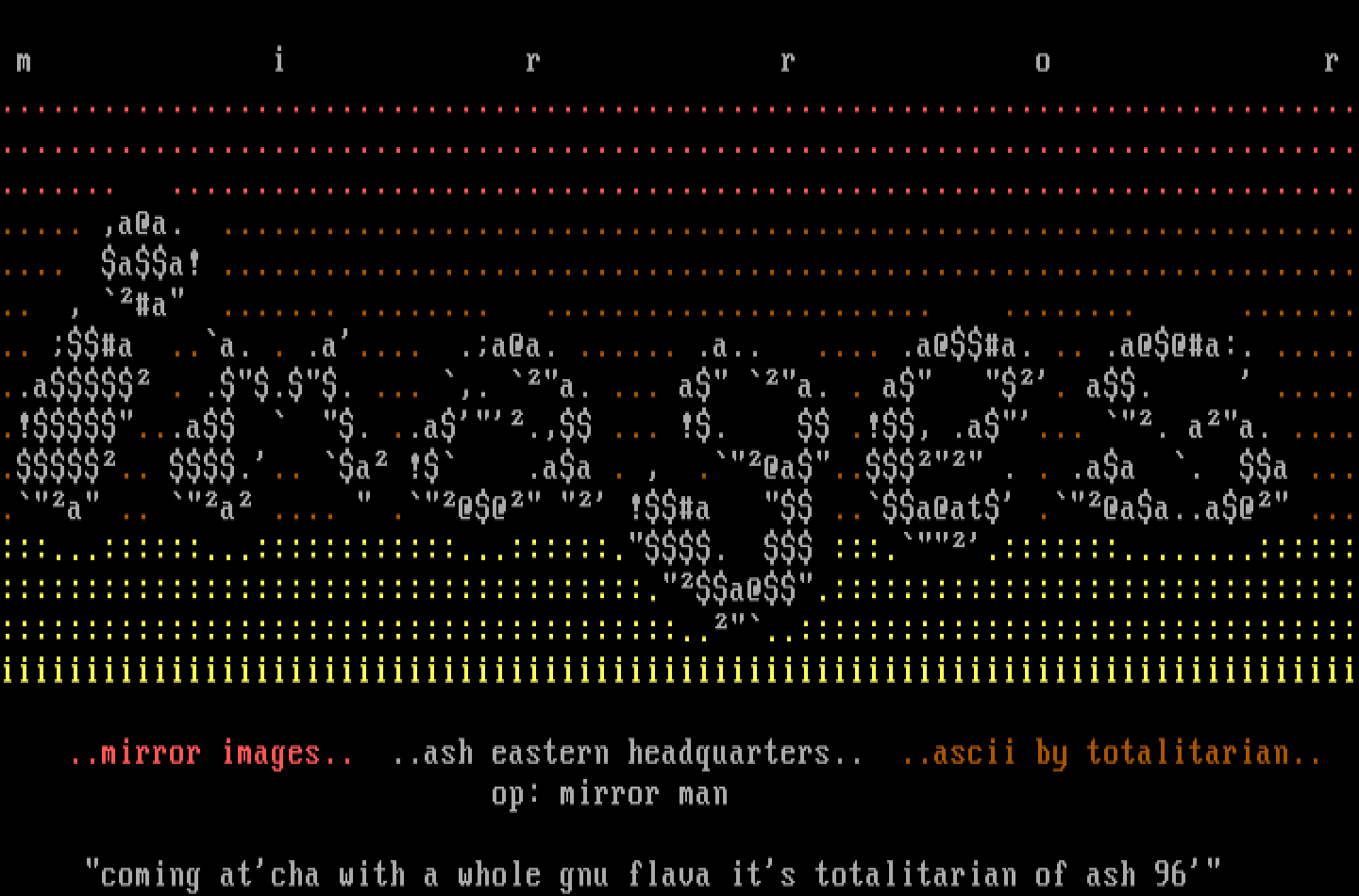 ..mirror images.. ..ash eastern headquarters.. ..ascii by totalitarian..