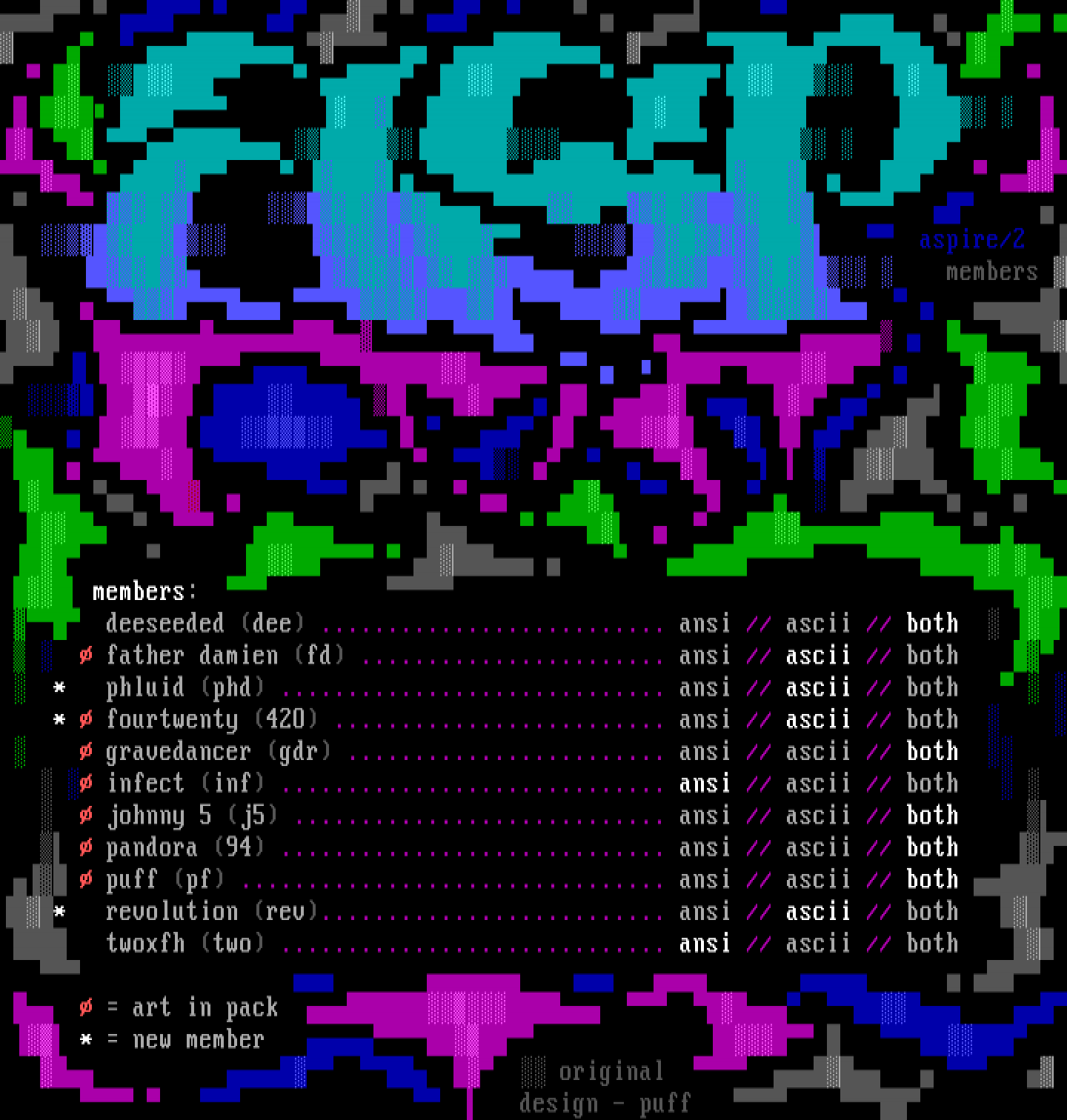 * phluid phd ............................. ansi // ascii // both * fourtwenty 42O ......................... ansi // ascii // both gravedancer gdr ........................ ansi // ascii // both infect inf ............................. ansi // ascii // both johnny 5 j5 ............................ ansi // ascii // both