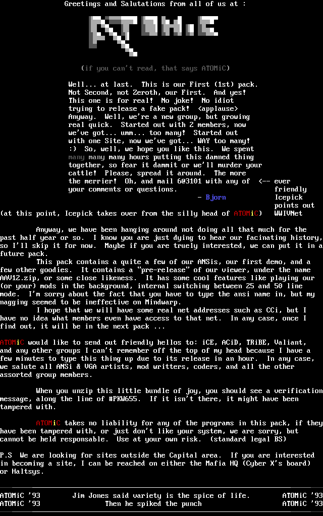 ATOMiC would like to send out friendly hellos to: iCE, ACiD, TRiBE, Valiant,