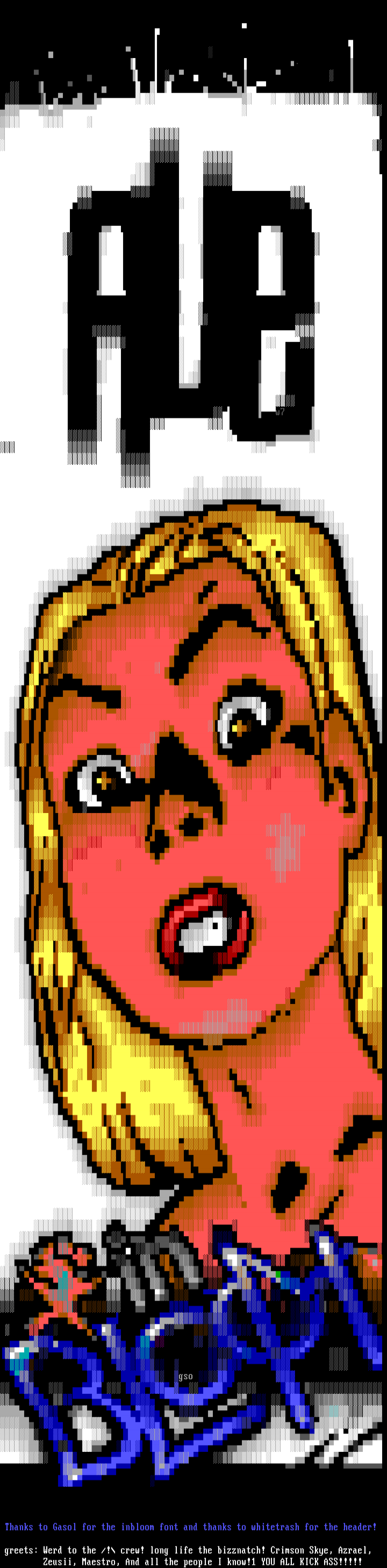 greets: Werd to the /! crew! long life the bizznatch! Crimson Skye, Azrael,