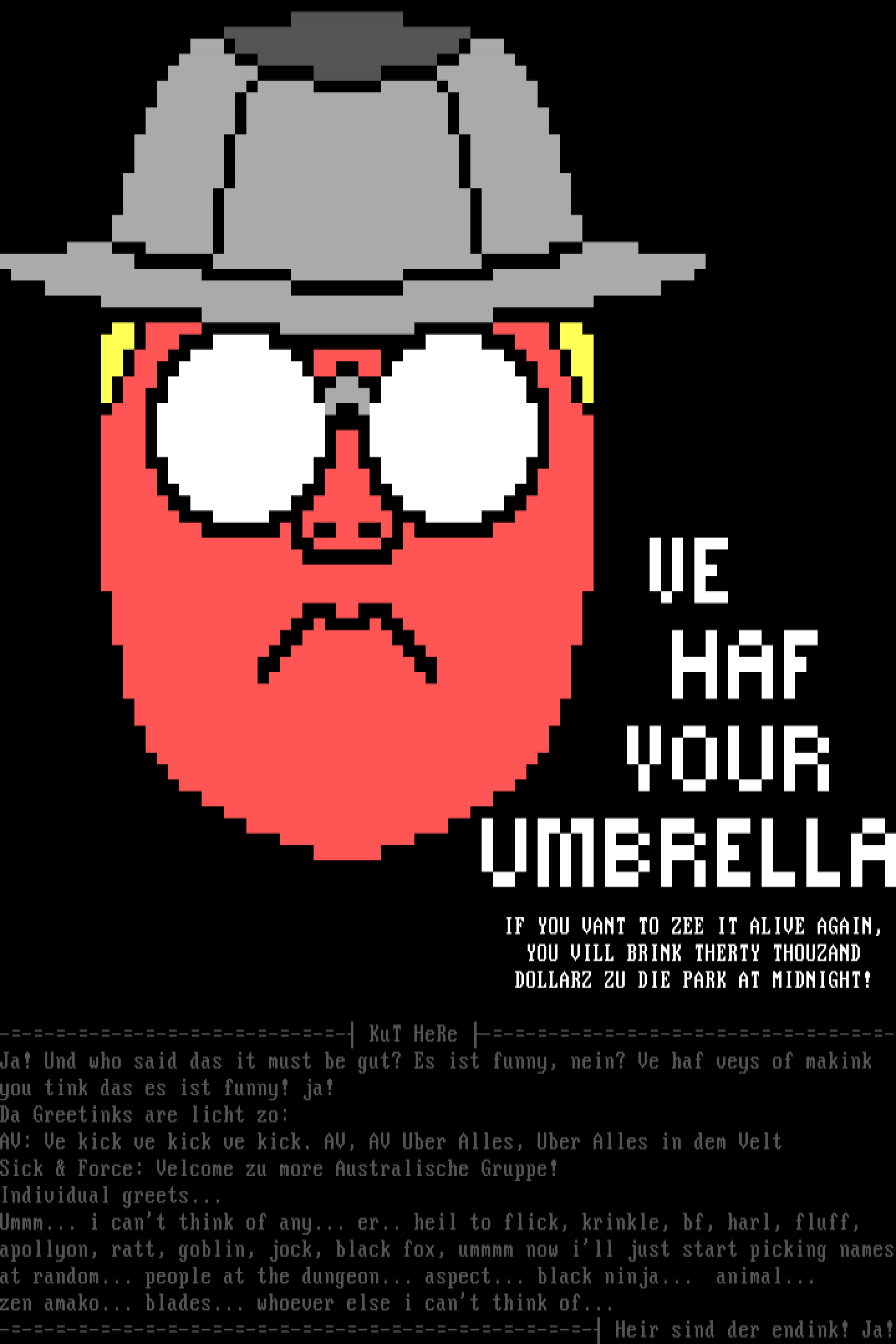 ---------------- KuT HeRe -------------------Ja! Und who said das it must be gut? Es ist funny, nein? Ve haf veys of makink