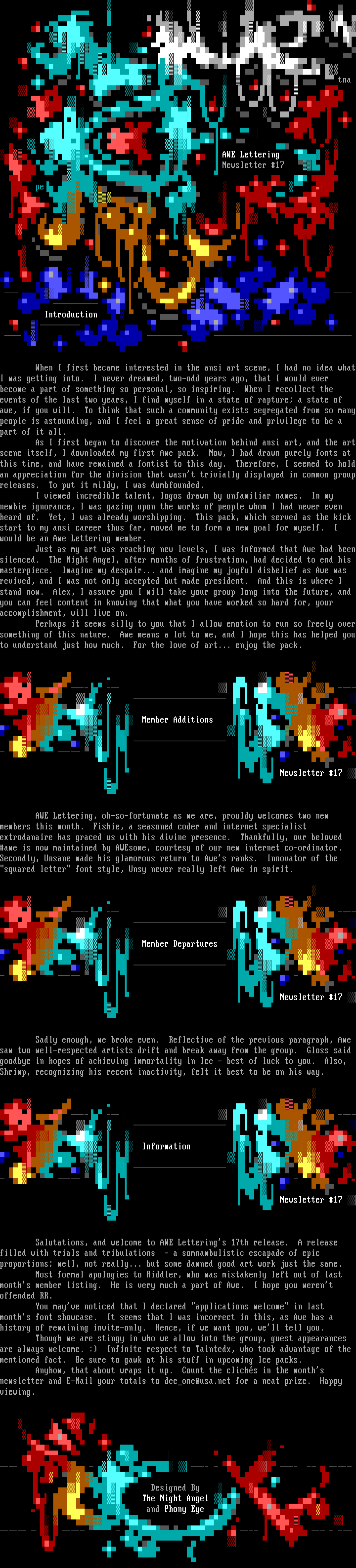 When I first became interested in the ansi art scene, I had no idea whatI was getting into. I never dreamed, two-odd years ago, that I would ever become a part of something so personal, so inspiring. When I recollect the events of the last two years, I find myself in a state of rapture a state of awe, if you will. To think that such a community exists segregated from so manypeople is astounding, and I feel a great sense of pride and privilege to be a part of it all.