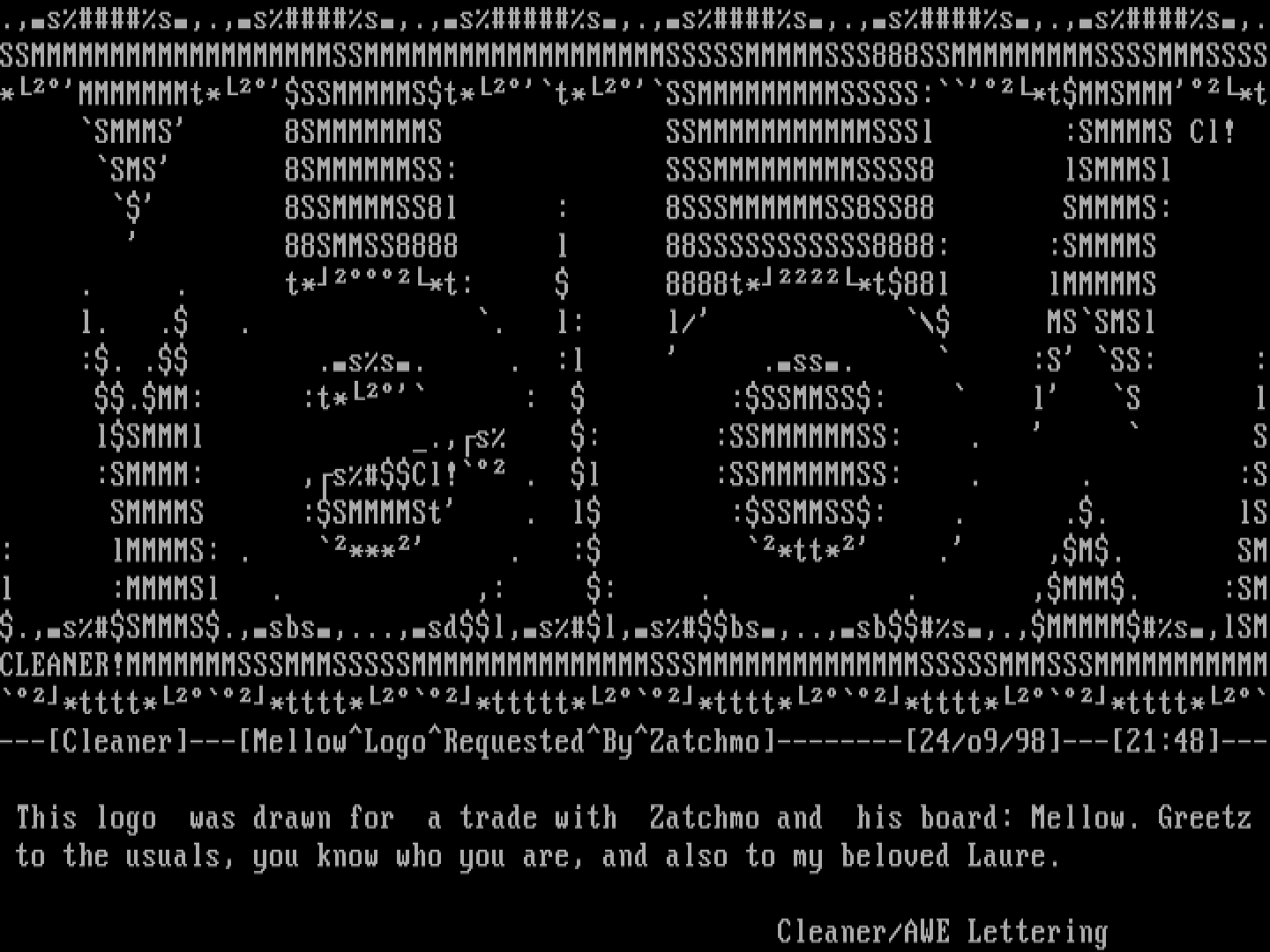 :. . .ss. . :l .ss. :S SS: : .MM: :t* : :SSMMSS: l S l lSMMMl .,s : :SSMMMMMMSS: . S :SMMMM: ,sCl! . l :SSMMMMMMSS: . . :S SMMMMS :SMMMMSt . l :SSMMSS: . .. lS: lMMMMS: . *** . : *tt* . ,M. SMl :MMMMSl . ,: : . . ,MMM. :SM.,sSMMMS.,sbs,...,sdl,sl,sbs,..,sbs,.,MMMMMs,lSMCLEANER!MMMMMMMSSSMMMSSSSSMMMMMMMMMMMMMMMSSSMMMMMMMMMMMMMMSSSSSMMMSSSMMMMMMMMMMM*tttt**tttt**ttttt**tttt**tttt**tttt*---Cleaner---MellowLogoRequestedByZatchmo--------24/o9/98---21:48---