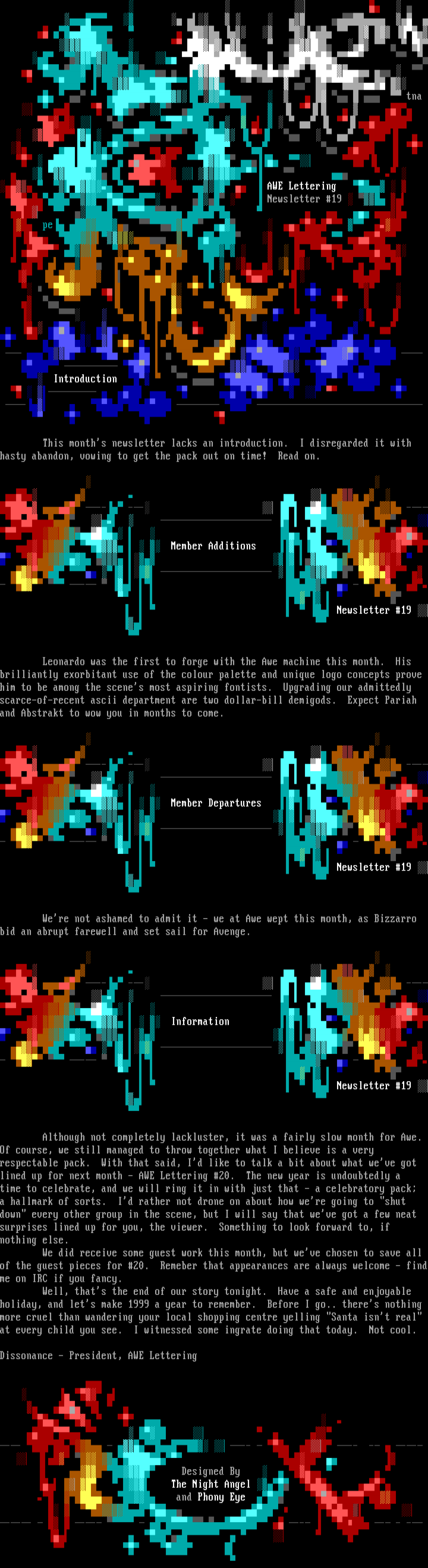 brilliantly exorbitant use of the colour palette and unique logo concepts prove him to be among the scenes most aspiring fontists. Upgrading our admittedly scarce-of-recent ascii department are two dollar-bill demigods. Expect Pariah
