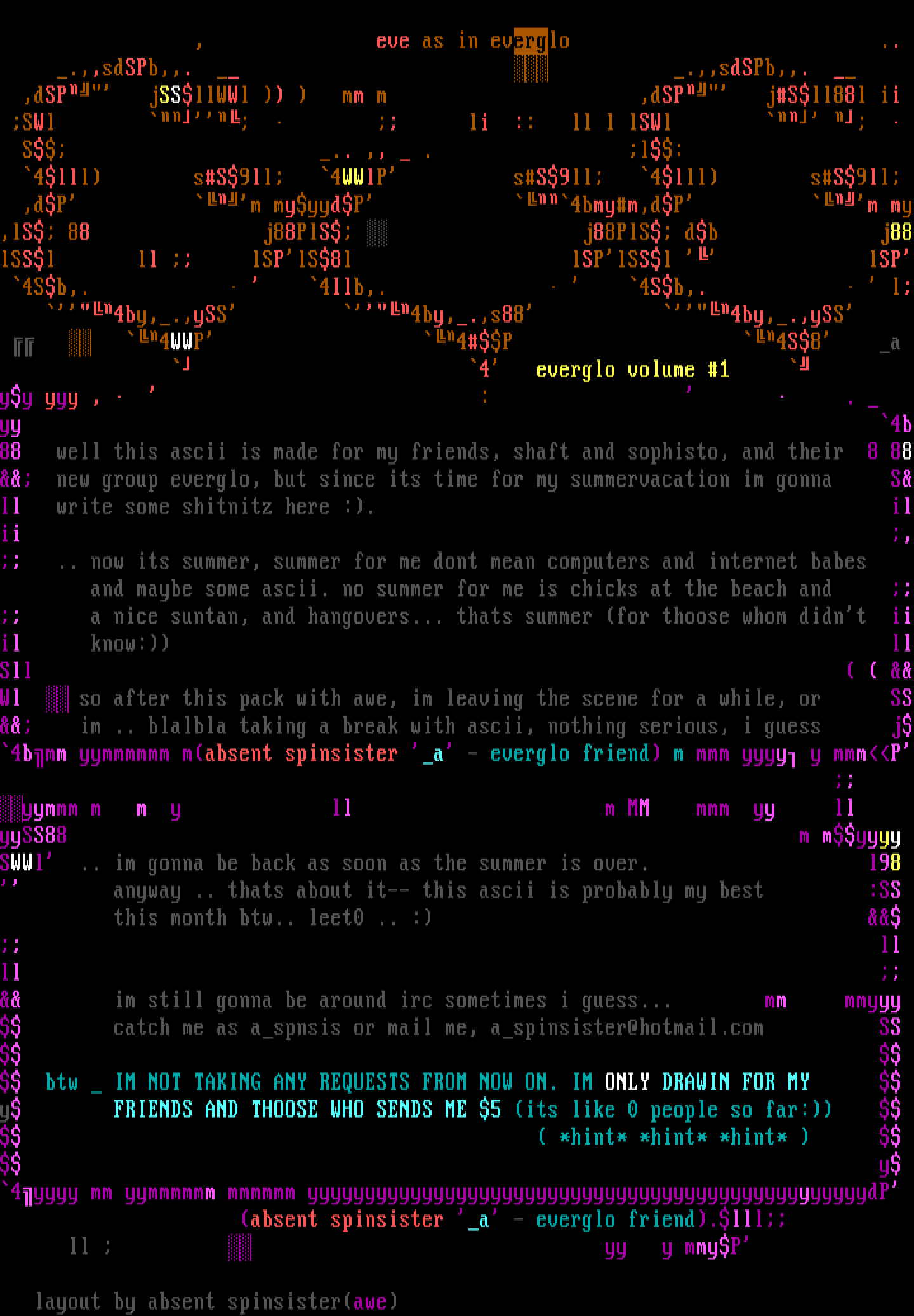 and maybe some ascii. no summer for me is chicks at the beach and a nice suntan, and hangovers... thats summer for thoose whom didnt iiil know: llSll Wl so after this pack with awe, im leaving the scene for a while, or SS im .. blalbla taking a break with ascii, nothing serious, i guess j4bmm yymmmmmm mabsent spinsister a - everglo friend m mmm yyyy y mmmP