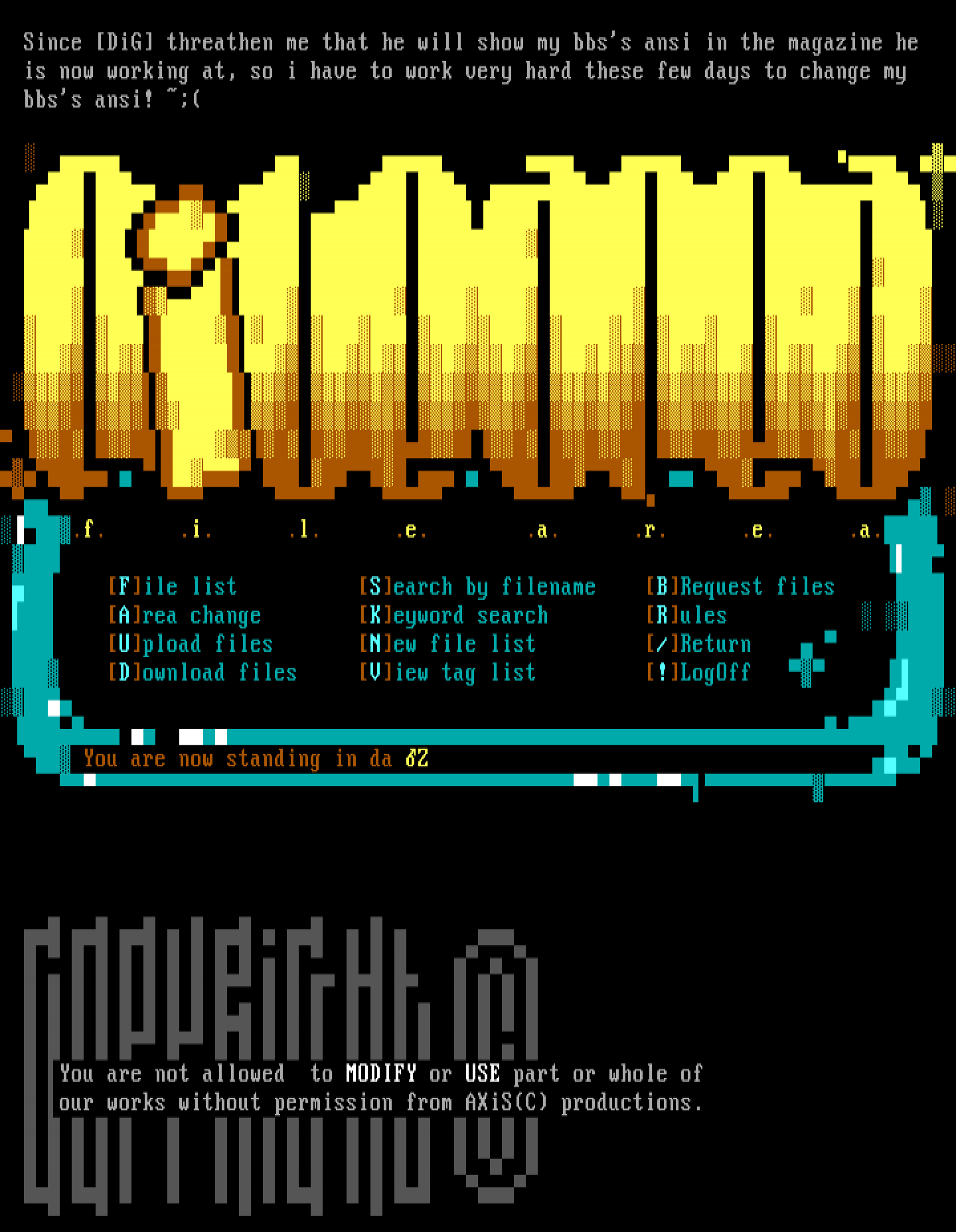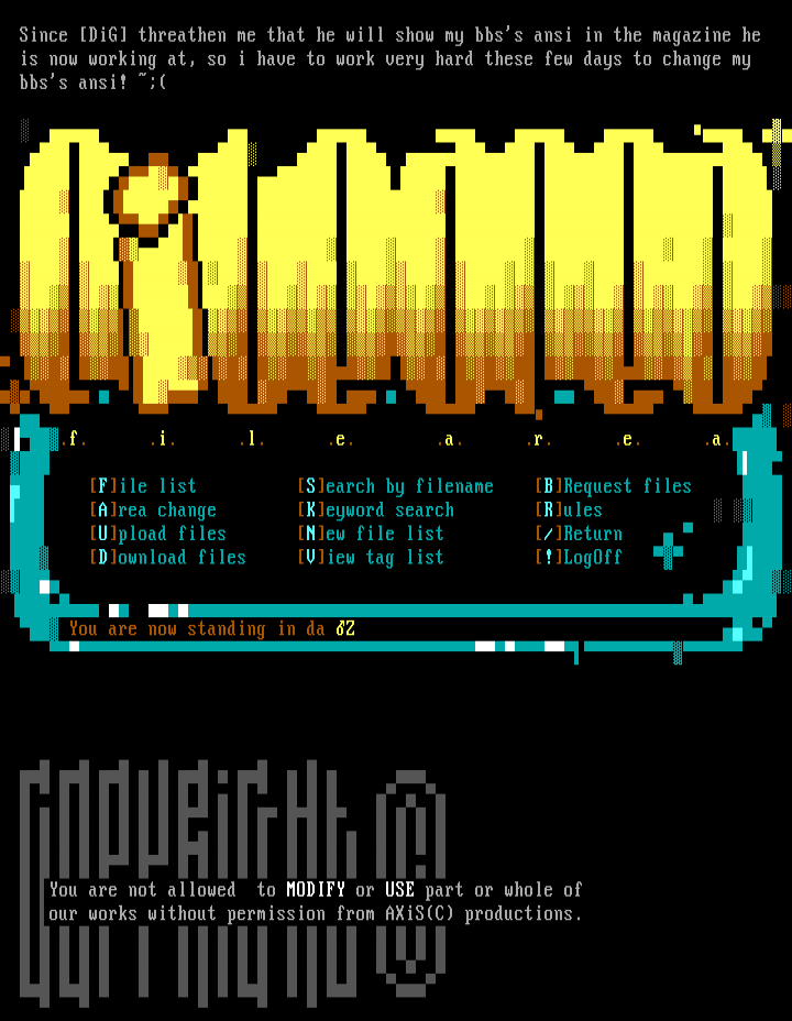 Since DiG threathen me that he will show my bbss ansi in the magazine he