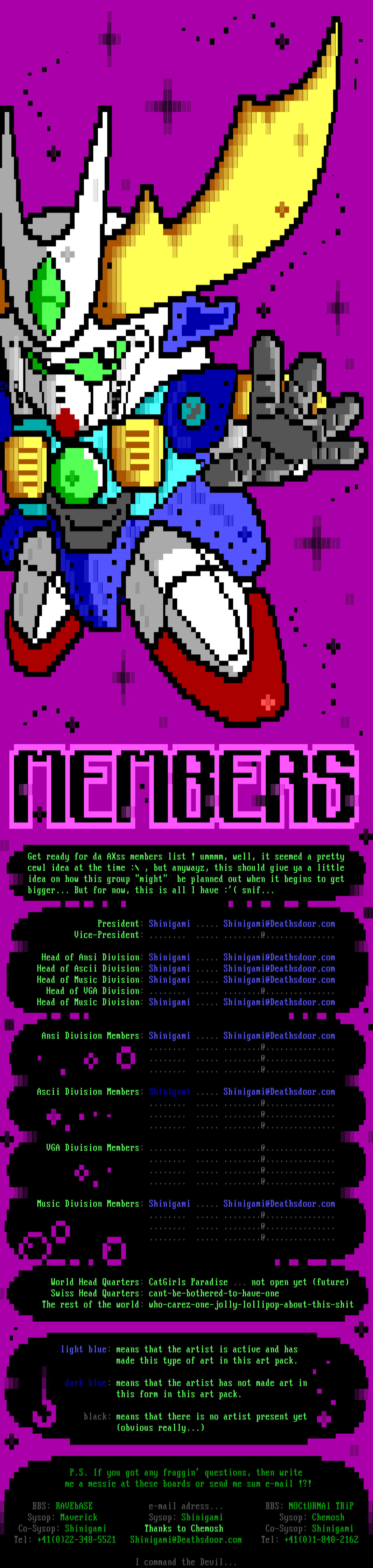 h h h h h h h h h hh h h h h h h h h h hh hh hh h .h h h h hh hh hh hh hh hh hh hhh Get ready for da AXss members list ! ummmm, well, it seemed a pretty cewl idea at the time : , but anywayz, this should give ya a little idea on how this group might be planned out when it begins to get bigger... But for now, this is all I have : snif... President: Shinigami ..... Shinigami@Deathsdoor.com Vice-President: ........ ..... ........@............... Head of Ansi Division: Shinigami ..... Shinigami@Deathsdoor.com Head of Ascii Division: Shinigami ..... Shinigami@Deathsdoor.com Head of Music Division: Shinigami ..... Shinigami@Deathsdoor.com Head of VGA Division: ........ ..... ........@............... Head of Music Division: Shinigami ..... Shinigami@Deathsdoor.com Ansi Division Members: Shinigami ..... Shinigami@Deathsdoor.com ........ ..... ........@............... ........ ..... ........@............... ........ ..... ........@............... Ascii Division Members: Shinigami ..... Shinigami@Deathsdoor.com ........ ..... ........@............... ........ ..... ........@............... ........ ..... ........@............... VGA Division Members: ........ ..... ........@............... ........ ..... ........@............... ........ ..... ........@............... ........ ..... ........@............... Music Division Members: Shinigami ..... Shinigami@Deathsdoor.com ........ ..... ........@............... ........ ..... ........@............... ........ ..... ........@............... World Head Quarters: CatGirls Paradise ... not open yet future Swiss Head Quarters: cant-be-bothered-to-have-one The rest of the world: who-carez-one-jolly-lollipop-about-this-shit light blue: means that the artist is active and has made this type of art in this art pack. dark blue: means that the artist has not made art in this form in this art pack. black: means that there is no artist present yet obvious really... P.S. If you got any fraggin questions, then write me a messie at these boards or send me sum e-mail !?! BBS: RAVEbASE e-mail adress... BBS: NOCtURNAl TRiP Sysop: Maverick Sysop: Shinigami Sysop: Chemosh Co-Sysop: Shinigami Thanks to Chemosh Co-Sysop: Shinigami Tel: +41022-348-5521 Shinigami@Deathsdoor.com Tel: +4101-840-2162