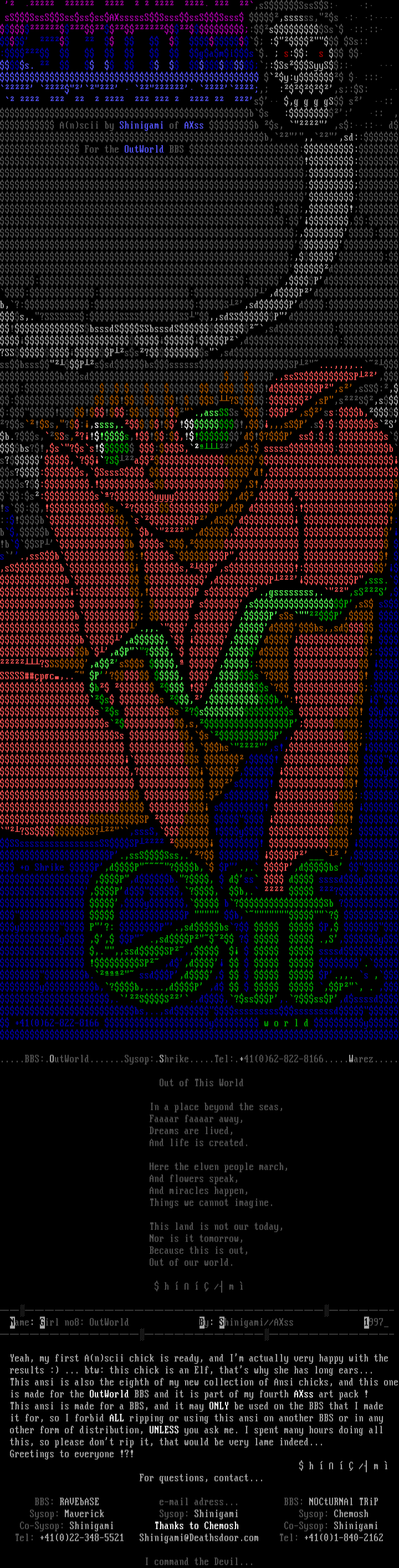 This ansi is also the eighth of my new collection of Ansi chicks, and this one is made for the OutWorld BBS and it is part of my fourth AXss art pack !