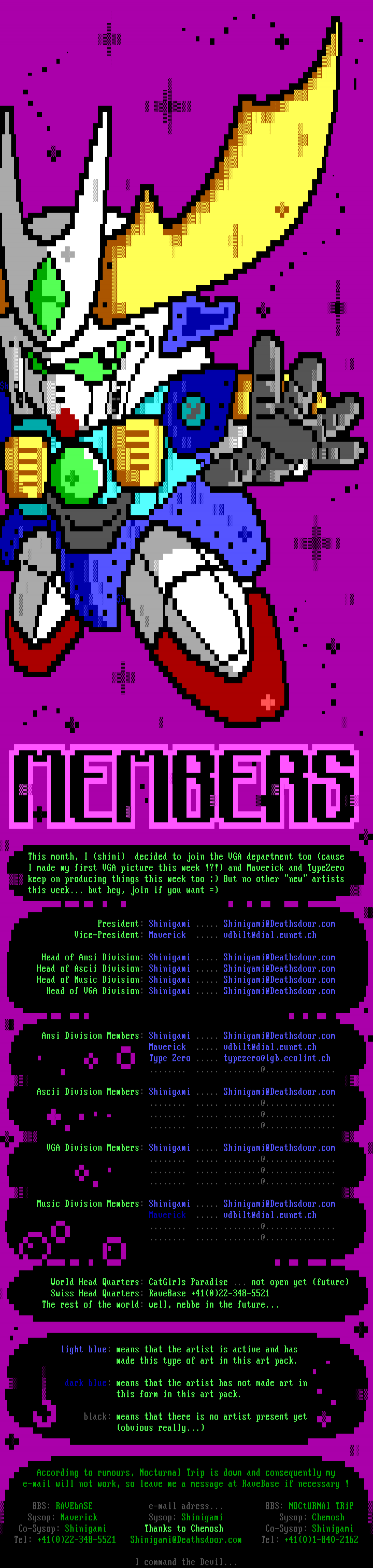 h h h h h h h h h hh h h h h h h h h h hh hh hh h .h h h h hh hh hh hh hh hh hh hhh This month, I shini decided to join the VGA department too cause I made my first VGA picture this week !?! and Maverick and TypeZero keep on producing things this week too But no other new artists this week... but hey, join if you want President: Shinigami ..... Shinigami@Deathsdoor.com Vice-President: Maverick ..... vdbilt@dial.eunet.ch Head of Ansi Division: Shinigami ..... Shinigami@Deathsdoor.com Head of Ascii Division: Shinigami ..... Shinigami@Deathsdoor.com Head of Music Division: Shinigami ..... Shinigami@Deathsdoor.com Head of VGA Division: Shinigami ..... Shinigami@Deathsdoor.com Ansi Division Members: Shinigami ..... Shinigami@Deathsdoor.com Maverick ..... vdbilt@dial.eunet.ch Type Zero ..... typezero@lgb.ecolint.ch ........ ..... ........@............... Ascii Division Members: Shinigami ..... Shinigami@Deathsdoor.com ........ ..... ........@............... ........ ..... ........@............... ........ ..... ........@............... VGA Division Members: Shinigami ..... Shinigami@Deathsdoor.com ........ ..... ........@............... ........ ..... ........@............... ........ ..... ........@............... Music Division Members: Shinigami ..... Shinigami@Deathsdoor.com Maverick ..... vdbilt@dial.eunet.ch ........ ..... ........@............... ........ ..... ........@............... World Head Quarters: CatGirls Paradise ... not open yet future Swiss Head Quarters: RaveBase +41022-348-5521 The rest of the world: well, mebbe in the future... light blue: means that the artist is active and has made this type of art in this art pack. dark blue: means that the artist has not made art in this form in this art pack. black: means that there is no artist present yet obvious really... According to rumours, Nocturnal Trip is down and consequently my e-mail will not work, so leave me a message at RaveBase if necessary ! BBS: RAVEbASE e-mail adress... BBS: NOCtURNAl TRiP Sysop: Maverick Sysop: Shinigami Sysop: Chemosh Co-Sysop: Shinigami Thanks to Chemosh Co-Sysop: Shinigami Tel: +41022-348-5521 Shinigami@Deathsdoor.com Tel: +4101-840-2162