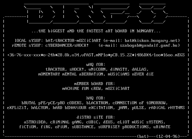 lOCAL sYSOP: bAT/tRACKTOR-mOZiCART e-mail: bat@kiskun.hungary.net