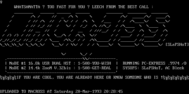 NoDE 2 14.4k ZooM V.32bis : 1-508-GET-REAL SYSOPS: SLaPSHoT, AC Bleek