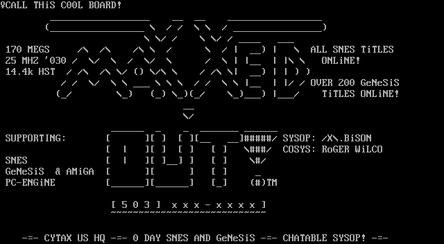 -- CYTAX US HQ -- 0 DAY SNES AND GeNeSiS -- CHATABLE SYSOP! --