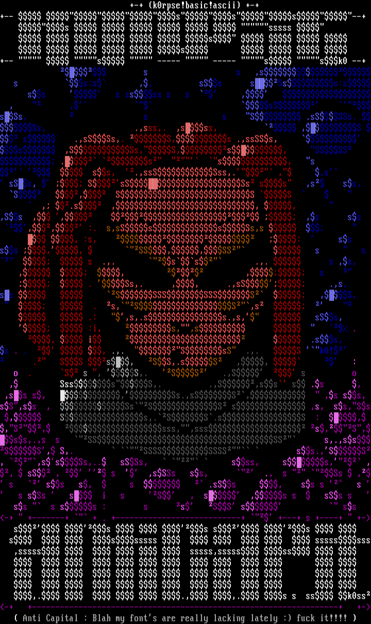 ,. ., ,. s s ss k0ss-+ +------------------------------------------------------------------+ +- Anti Capital : Blah my fonts are really lacking lately : fuck it!!!!