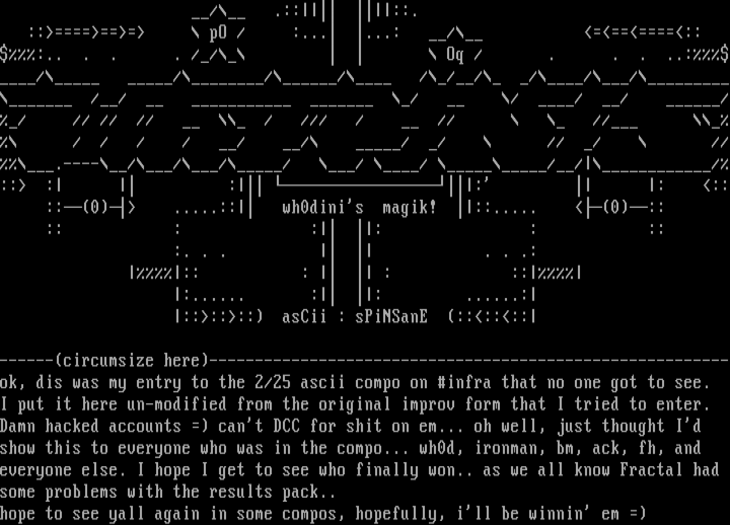 ------circumsize here---------------------------------------------------------ok, dis was my entry to the 2/25 ascii compo on infra that no one got to see.