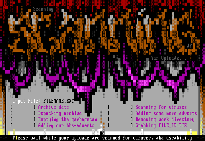JY Yar Uploadz... InputFile:FILENAME.EXT Archivedate Scanning for viruses Depacking archive Adding some more adverts