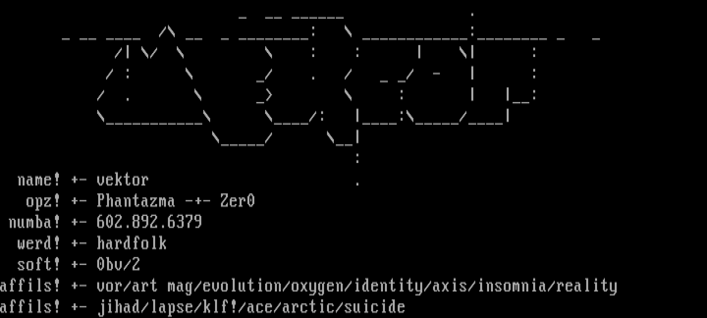 affils! +- vor/art mag/evolution/oxygen/identity/axis/insomnia/reality