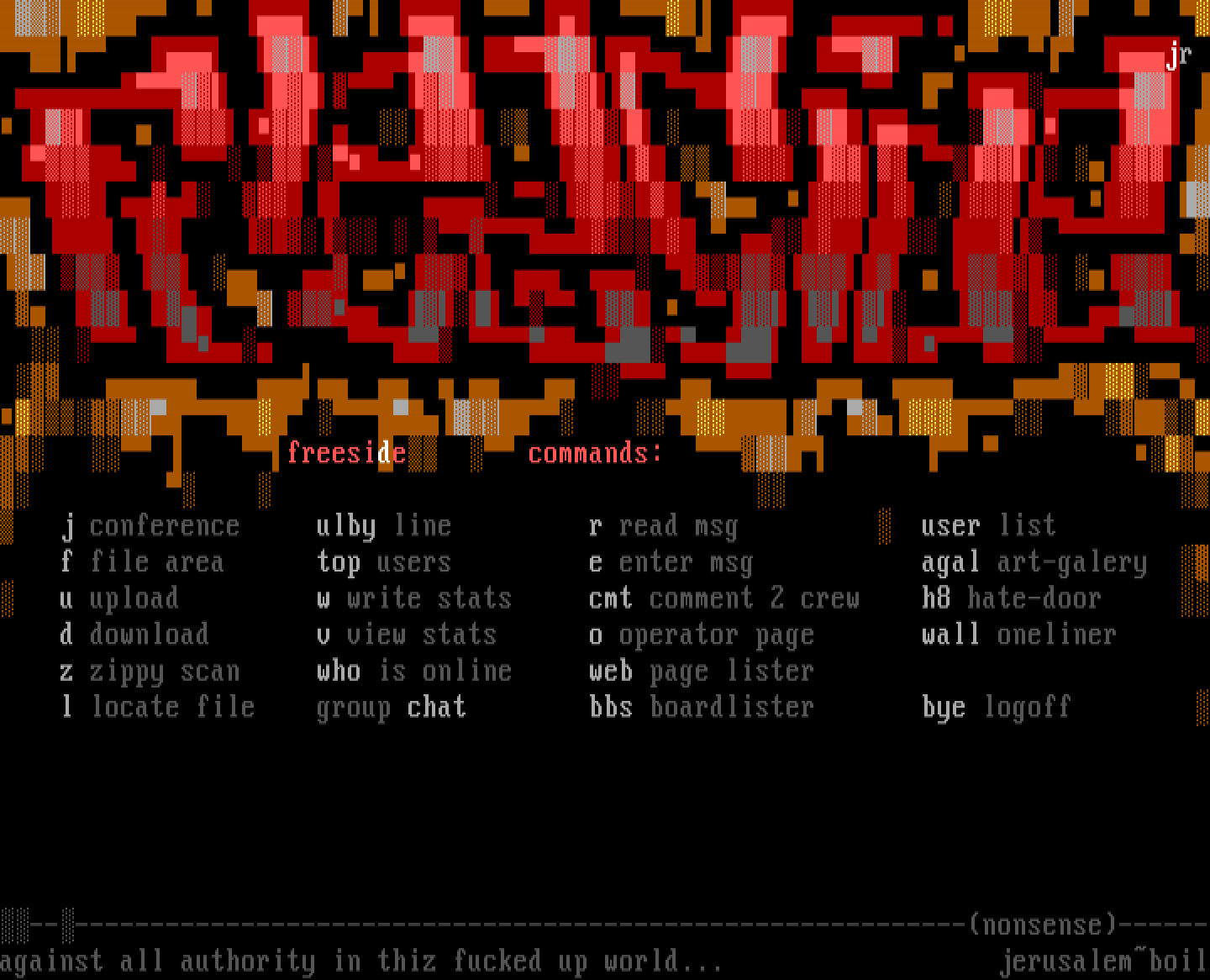 f file area top users e enter msg agal art-galery u upload w write stats cmt comment 2 crew h8 hate-door d download v view stats o operator page wall oneliner