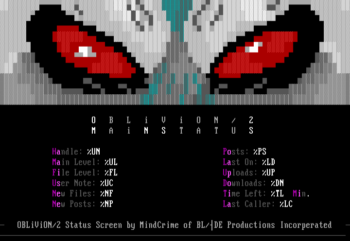 O B L i V i O N / 2M A i N S T A T U SHandle: Posts:MainLevel: LastOn:FileLevel: Uploads:UserNote: Downloads:NewFiles: TimeLeft: Min.NewPosts: LastCaller: OBLiViON/2StatusScreenbyMindCrimeofBL/DEProductionsIncorperated UNULFLUCNFNPPSLDUPDNTLLC
