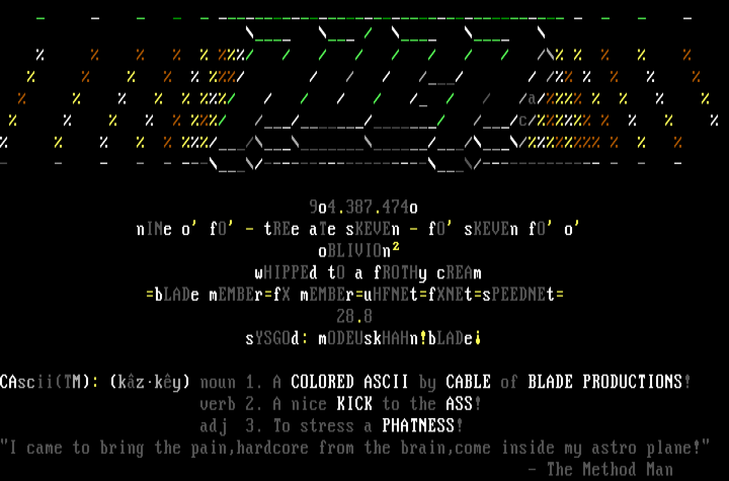 CAsciiTM: kzky noun 1. A COLORED ASCII by CABLE of BLADE PRODUCTIONS!