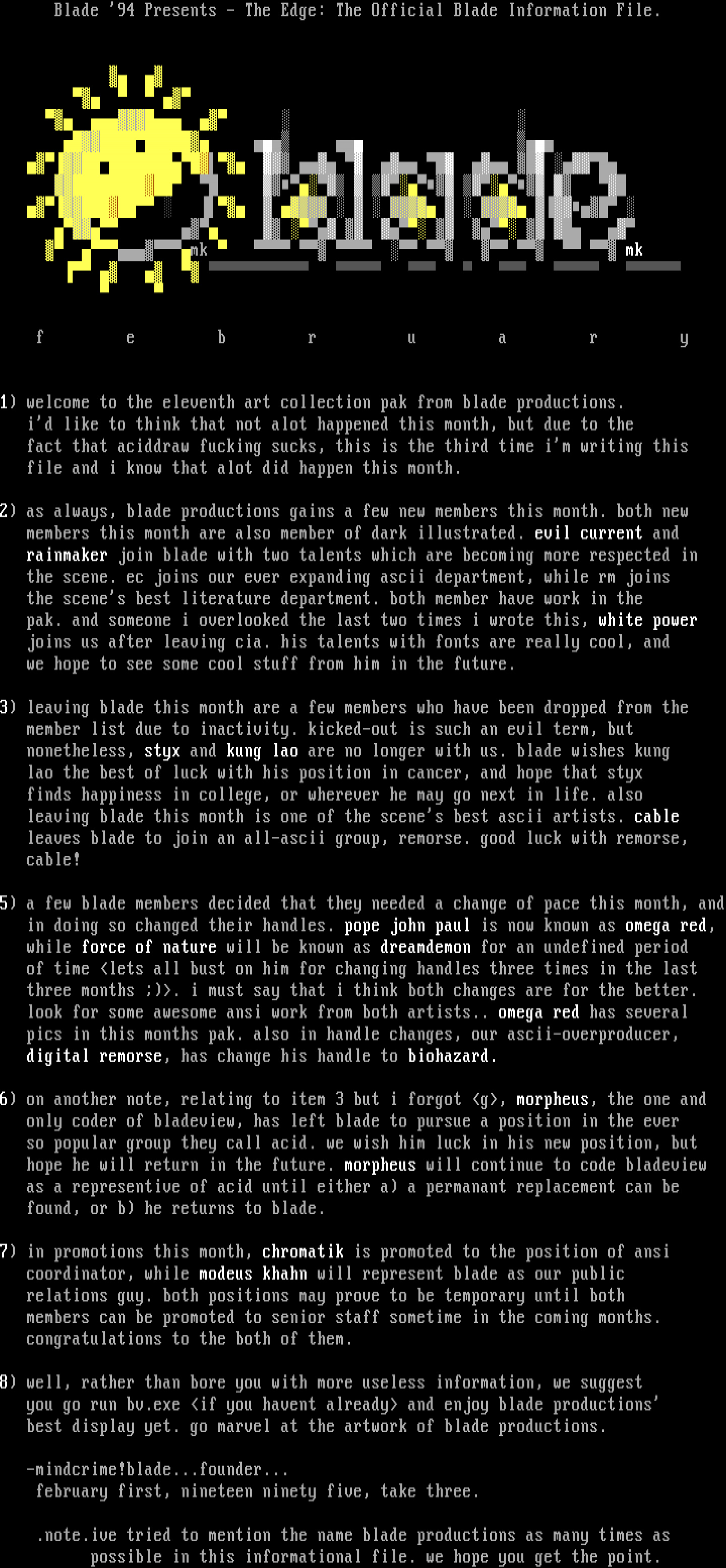 pics in this months pak. also in handle changes, our ascii-ove