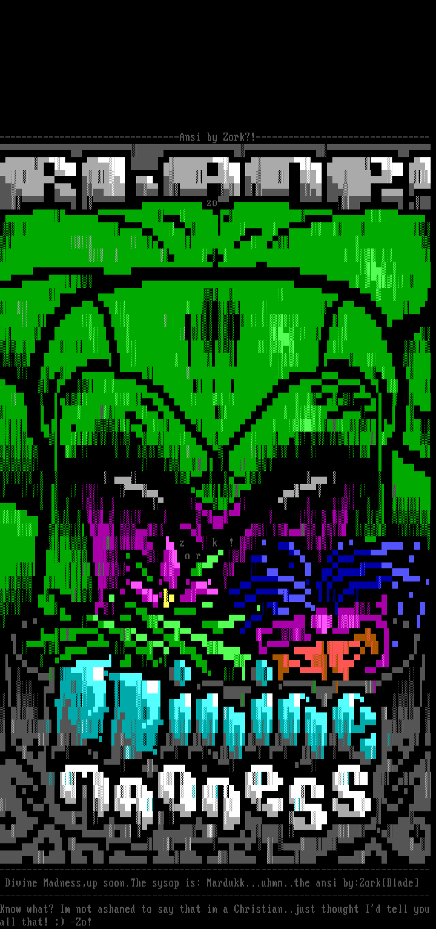 ------------------------------------------------------------------------------- Divine Madness,up soon.The sysop is: Mardukk...uhmm..the ansi by:ZorkBlade