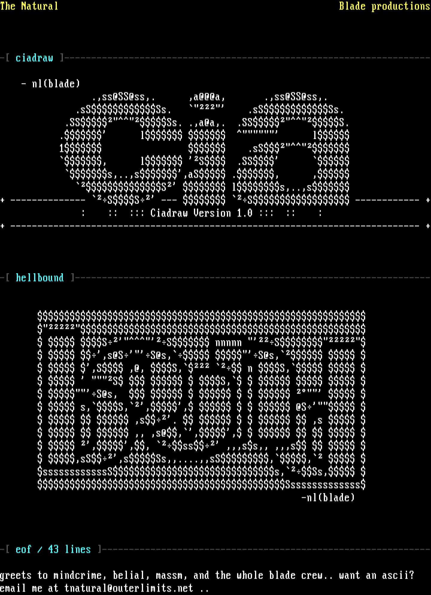 greets to mindcrime, belial, massm, and the whole blade crew.. want an ascii?