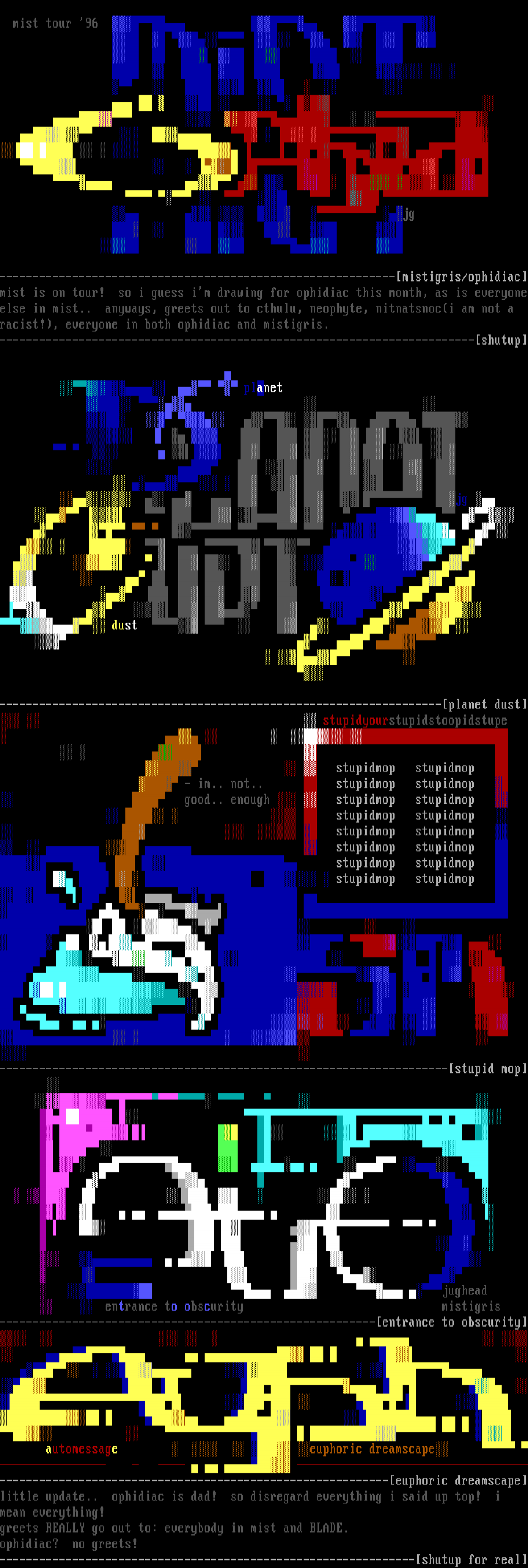 ------------------------------------------------------------mistigris/ophidiacmist is on tour! so i guess im drawing for ophidiac this month, as is everyoneelse in mist.. anyways, greets out to cthulu, neophyte, nitnatsnoci am not a