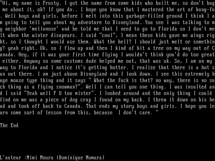 Hi, my name is Frosty. I got the name from some kids who built me, so dont bug me about it, ok? If you do.. I hope you know that I mastered the art of kung-fu. Well boys and girls, before I melt into this garbage-filled ground I think I am going to tell you about my adventure to Disneyland. You see I was talking to my neighbor mellonose and he told me that I need to go to Florida so I dont melt when the winter disapears. I said cool, I mean these kids gave me wings right, so I thought I would use them. What the hell? I should just melt or something? yeah right. Ok, so I flew up and then I kind of hit a tree on my way out of Canada. Hey, if it was your first time flying I wouldnt think youd do too great either. Anyway so some customs dude helped me out, that was ok. So, I am on my way to Florida and I notice its getting hotter. I realize that there is a hot sun out there. I am just above Disneyland and I look down. I see this extremely huge mouse type thing and it says What the fuck is that? no way, there is no such thing as a flying snowman?. Well I can tell you one thing. I was insulted and I said Yeah well F U too mister. I looked around and the only thing I could find on me was a piece of dog crap I found on my back. I threw it down on his head and took off back to Canada. That ends my story boys and girls. I hope you learn some sort of lesson from this, because I dont care.