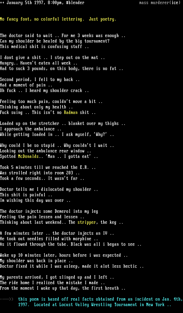 ++ January 5th 1997, 8:00pm, blender mass murdererice