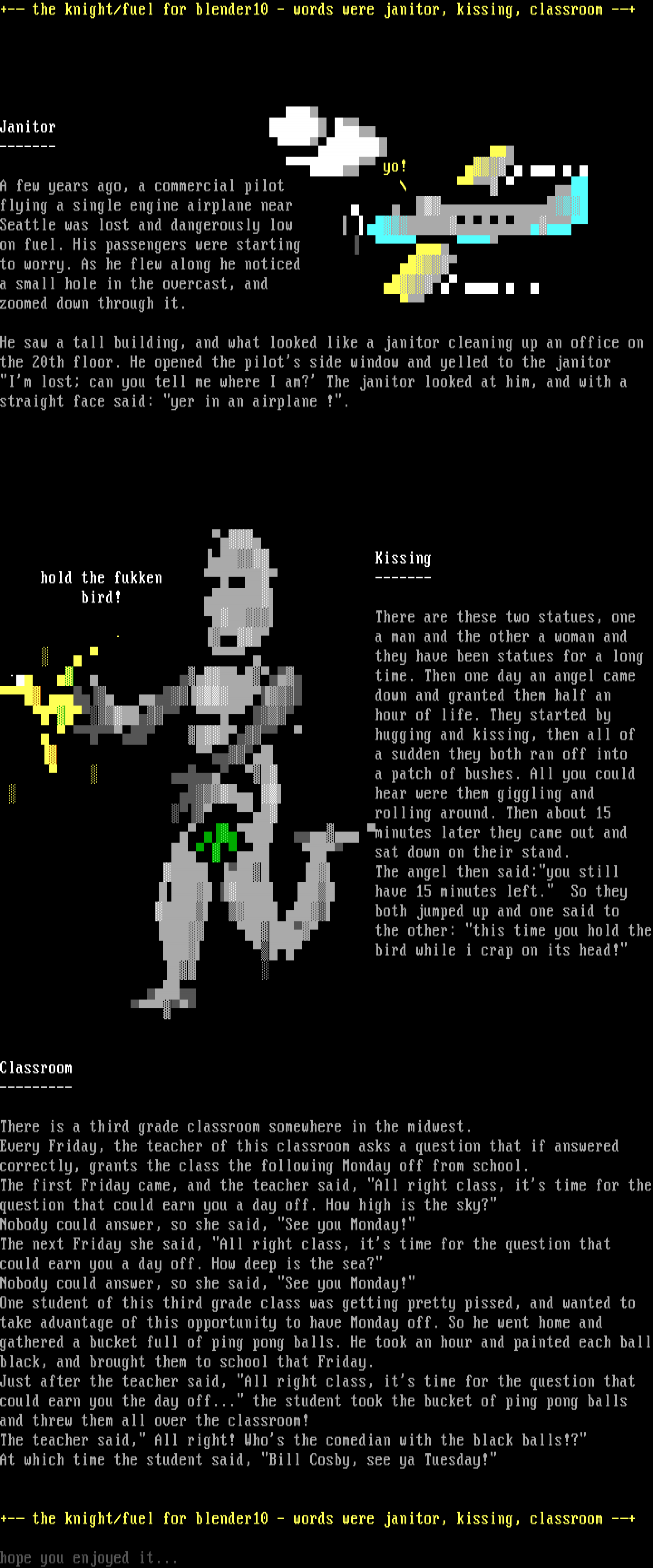 +- the knight/fuel for blender10 - words were janitor, kissing, classroom -+