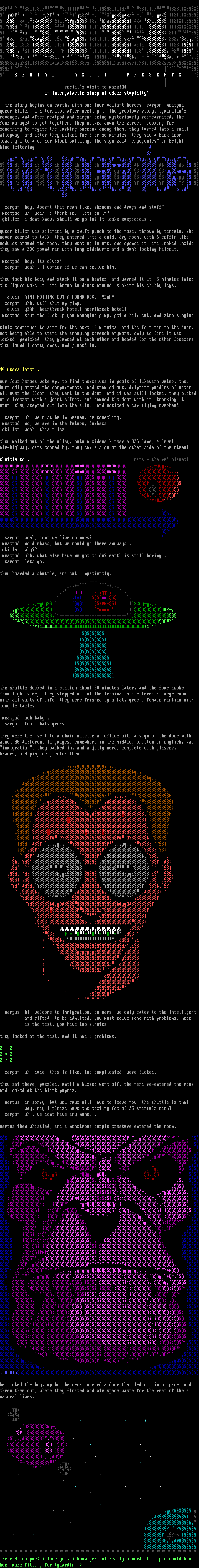 the story begins on earth, with our four valiant heroes, sargon, meatpod,