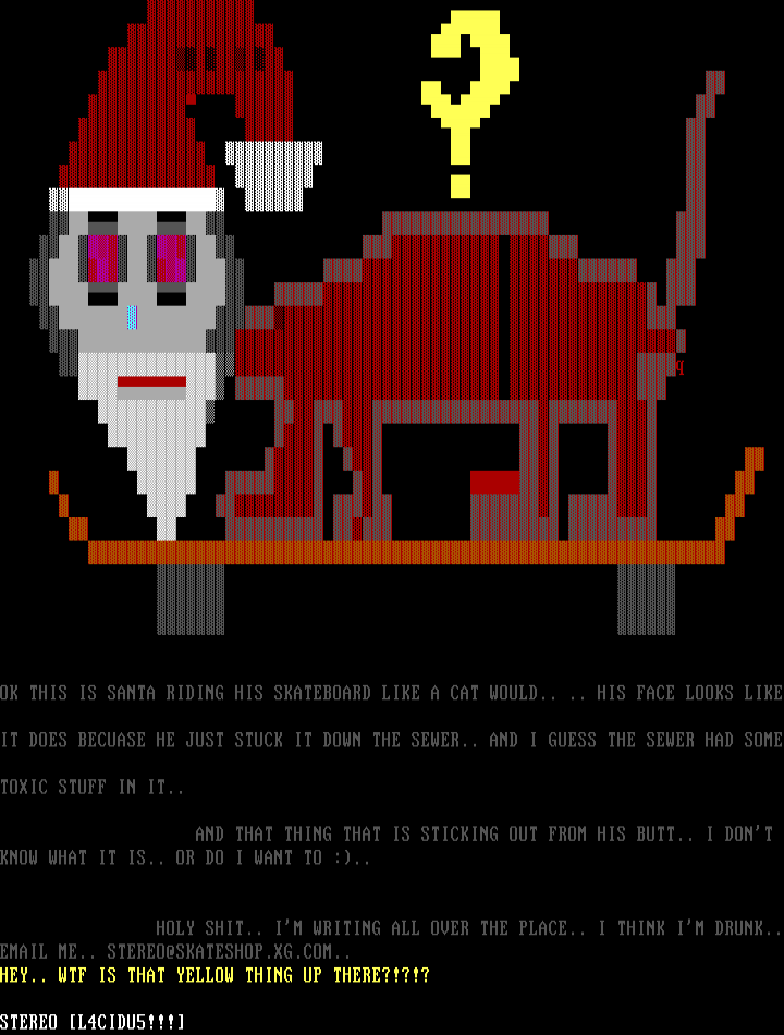 OK THIS IS SANTA RIDING HIS SKATEBOARD LIKE A CAT WOULD.. .. HIS FACE LOOKS LIKE
