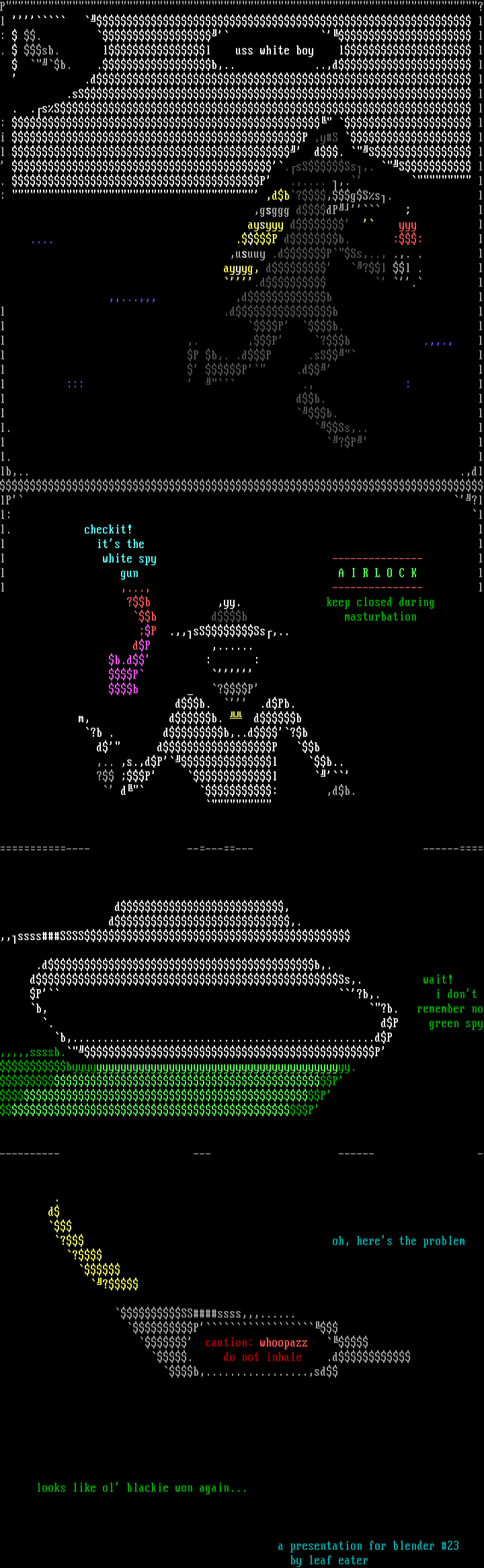 P?l l: . l. sb. ll uss white boy l l b. .b,.. ..,d l .d l .sS l . .sS l: li P ,yS ll d. S l .sSSs,. S l. P .,.... ,. l: ,db?,gSs. l ,gsggg ddP l aysyyy d yyy l .... .P db. :: l ,usuuy .dPSs,.., .,. . l ayyyg, d ?l l . l .d . l ,,...,,, ,db ll .db ll P b. ll ,. ,P ?b .,,., ll P b,. .dP .sS ll P .d ll ::: ., : ll db. ll b. ll. Ss,.. ll ?P ll. llb,.. .,dllP ?ll: ll. checkit! ll its the ll white spy --------------- ll gun A I R L O C K ll ,..., --------------- l ?b ,yy. keep closed during