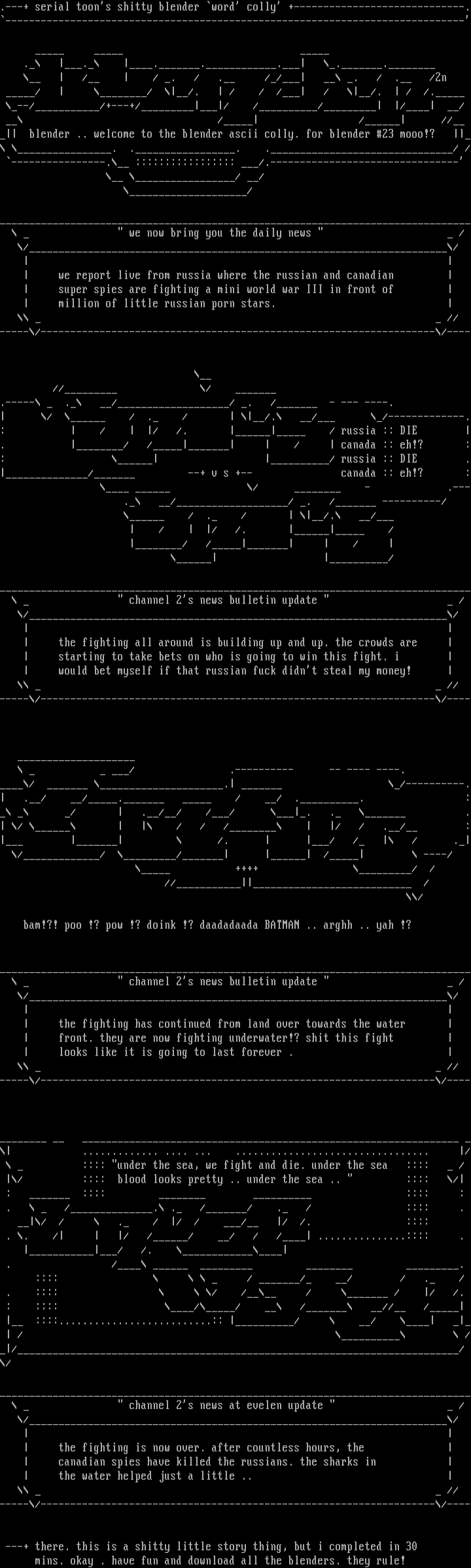 / / // blender .. welcome to the blender ascii colly. for blender 23 mooo!? . .. ./ / ----------------. ::::::::::::::::: /.--------------------------------