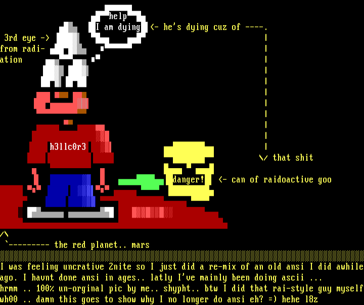 I was feeling uncrative 2nite so I just did a re-mix of an old ansi I did awhileago. I havnt done ansi in ages.. latly Ive mainly been doing ascii ...