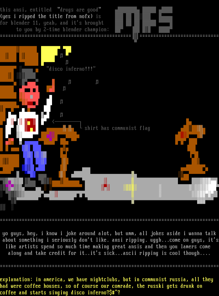 yo guys, hey, i know i joke around alot, but umm, all jokes aside i wanna talk about something i seriously dont like. ansi ripping. uggh...come on guys, its like artists spend so much time making great ansis and then you lamers come