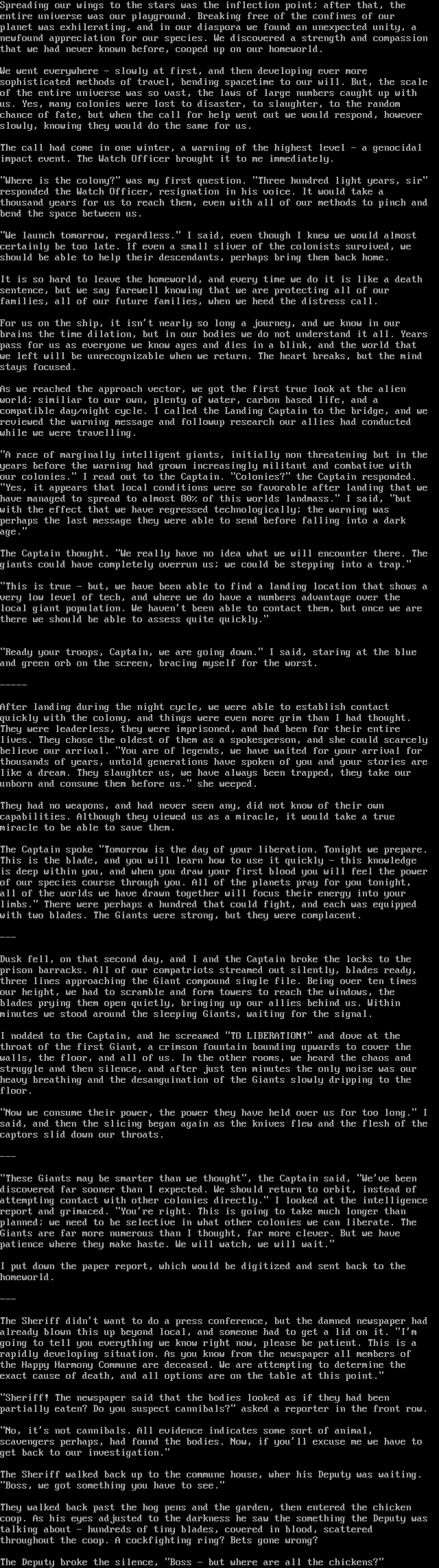 I nodded to the Captain, and he screamed TO LIBERATION! and dove at the