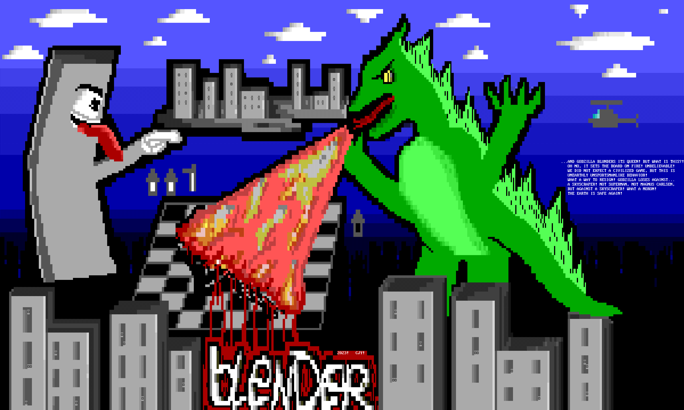 ...AND GODZILLA BLUNDERS ITS QUEEN! BUT WHAT IS THIS?! OH NO, IT SETS THE BOARD ON FIRE! UNBELIEVABLE! WE DID NOT EXPECT A CIVILIZED GAME, BUT THIS IS UNEARTHLY UNSPORTSMANLIKE BEHAVIOR! WHAT A WAY TO RESIGN! GODZILLA LOSES AGAINST... A SKYSCRAPER! NOT SUPERMAN, NOT MAGNUS CARLSEN, BUT AGAINST A SKYSCRAPER! WHAT A MORON! THE EARTH IS SAFE AGAIN!