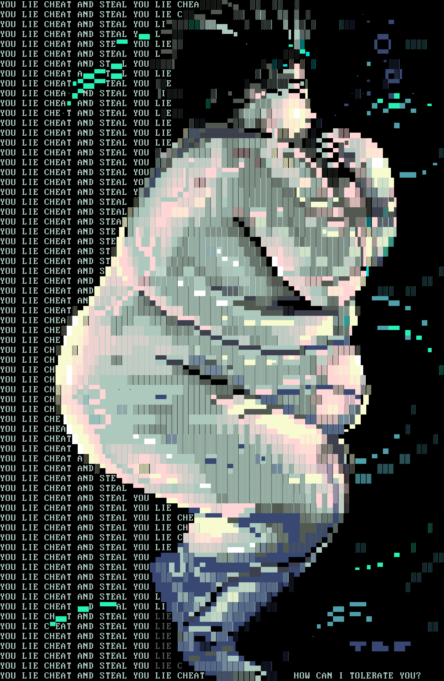 YOU LIE CHEAT AND STEAL YOU LIE CHEAT HOW CAN I TOLERATE YOU?