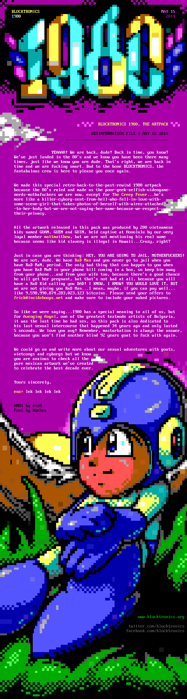 No BLOCKTRONICS 1980, THE ARTPACK DESINFORMATION FILE MAY 15 2014 YEAAAH! We are back, dude! Back in time, you know? Weve just landed in the 80s and we know you have been there manytimes, just like we know you are dude. Thats right, we are back intime and we are fucking smart. Bad to the bone BLOCKTRONICS, thefantabulous crew is here to please you once again.We made this special retro-back-to-the-past-rewind 1980 artpackbecause the 80s ruled and made us the poor-geek-selfish-videogame-nerds-mothafuckers we are now, except for The Creep Fever...hes more like a killer-cyborg-sent-from-hell-who-fell-in-love-with-some-scene-girl-that-takes-photos-of-herself-with-wires-attached -to-her-body-but-we-are-not-saying-her-name-because-we-respect-their-privacy. All the artwork released in this pack was produced by 200 vietnamesekids named GUAN, GUEN and GUIN, held captive at Honolulu by our very loyal member mattmatthew, but we are not mentioning his real name because seems like kid slavery is illegal in Hawaii...Crazy, right? Just in case you are thinking: HEY, YOU ARE GOING TO JAIL, MOTHERFUCKERS!We are not, dude. We have RaD Man and you never go to jail when you have RaD MaN, period. The only bad thing that can happen to you when you have RaD MaN is your phone bill coming in a box, so keep him awayfrom your phone...and from your wife too, because theres a good chancehe will get her pregnant, but thats not bad at all, because you willhave a RaD Kid calling you DAD! I KNOW, I KNOW! YOU WOULD LOVE IT, BUTwe are not giving you RaD Man...I mean, maybe, if you can pay well...like 9,598,990,874,283,023,123 bitcoins. Please send your offers tofrick@insidehoops.net and make sure to include your naked pictures. So like we were saying...1980 has a special meaning to all of us, butfor Avenging Angel, one of the greatest textmode artists of Bulgaria,it was the last time he had sex, so this pack is also dedicated tohis last sexual intercourse that happened 34 years ago and only lasted 5 seconds. We love you avg! Remember, masturbation is always the answer,because you wont find another blind 92 years goat to fuck with again. We could go on and write more about our sexual adventures with goats,vietcongs and cyborgs but weknow you are anxious to check all the pure mexican artwork weve created to celebrate the best decade ever. Yours sincerely, enz lek lek lek lek