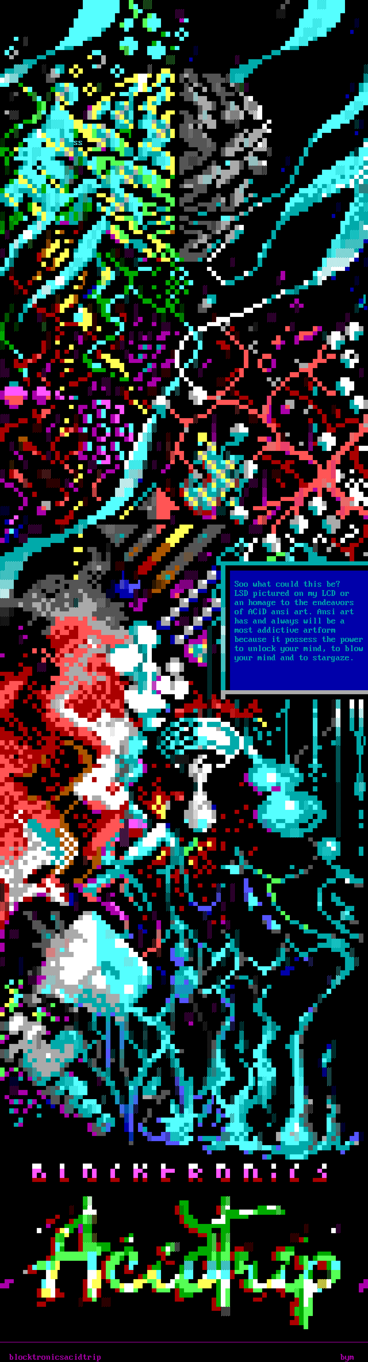 Soo what could this be? LSD pictured on my LCD or an homage to the endeavors of ACiD ansi art. Ansi art has and always will be a most addictive artform because it possess the power to unlock your mind, to blow your mind and to stargaze.