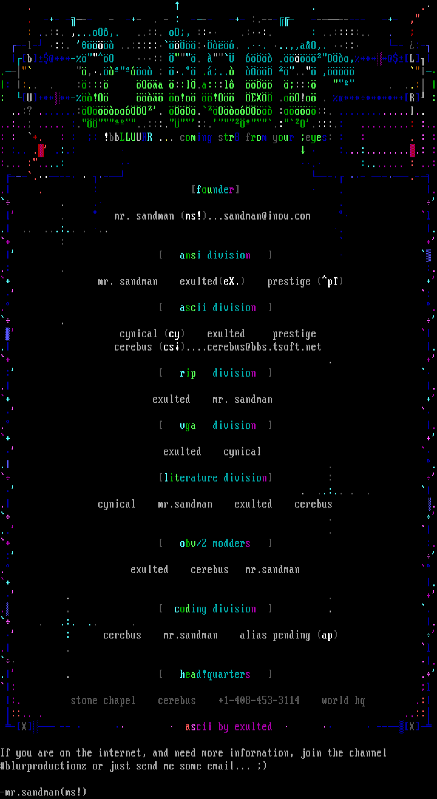 . . : founder . . . . . l . mr. sandman ms!...sandman@inow.com l . .. ...:.. . .. . .+ : + ansi division .: . :.+ mr. sandman exultedeX. prestige pT + : . ascii division . . cynical cy exulted prestige . cerebus cs....cerebus@bbs.tsoft.net .+ . + : rip division . .+ exulted mr. sandman + . vga division .+ + exulted cynical . . . literature division : . ..:.. . . . cynical mr.sandman exulted cerebus . . .. . + obv/2 modders :. : . exulted cerebus mr.sandman + . . . +. . coding division . . . .:. .. . . : cerebus mr.sandman alias pending ap . . l .. . head!quarters .: l :. stone chapel cerebus +1-408-453-3114 world hq .: