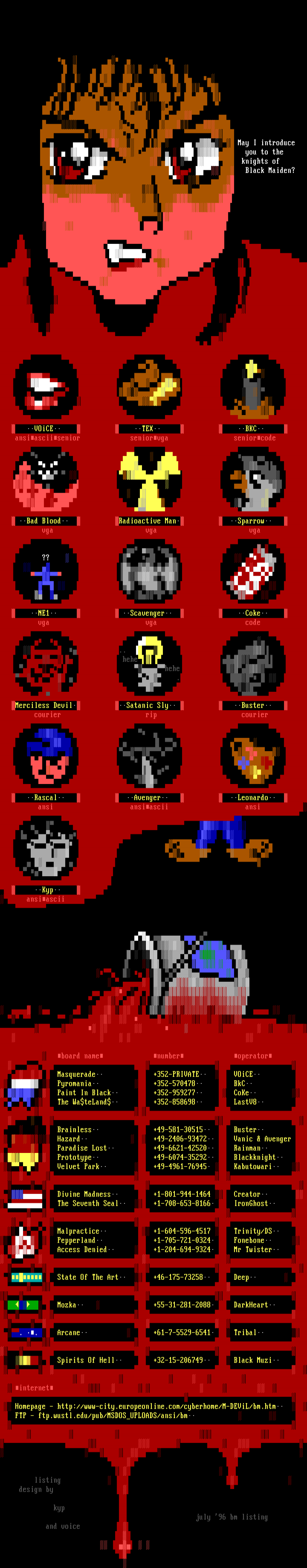 boardnamenumberoperator Masquerade +352-PRIVATE VOiCE Pyromania +352-570478 BkC Paint In Black +352-959277 CoKe The WateLand +352-858698 LastV8 Brainless +49-581-30515 Buster Hazard +49-2406-93472 Vanic Avenger Paradise Lost +49-6621-42520 Rainman Prototype +49-6074-35292 Blackknight Velvet Park +49-4961-76945 Kabutowari Divine Madness +1-801-944-1464 Creator The Seventh Seal +1-708-653-8166 IronGhost Malpractice +1-604-596-4517 Trinity/DS Pepperland +1-705-721-0324 Fonebone Access Denied +1-204-694-9324 Mr Twister State Of The Art +46-175-73258 Deep Mozka +55-31-281-2088 DarkHeart .. Arcane +61-7-5529-6541 Tribal Spirits Of Hell +32-15-206749 Black Muzi internet Homepage - http://www-city.europeonline.com/cyberhome/M-DEViL/bm.htm FTP - ftp.wustl.edu/pub/MSDOSUPLOADS/ansi/bm