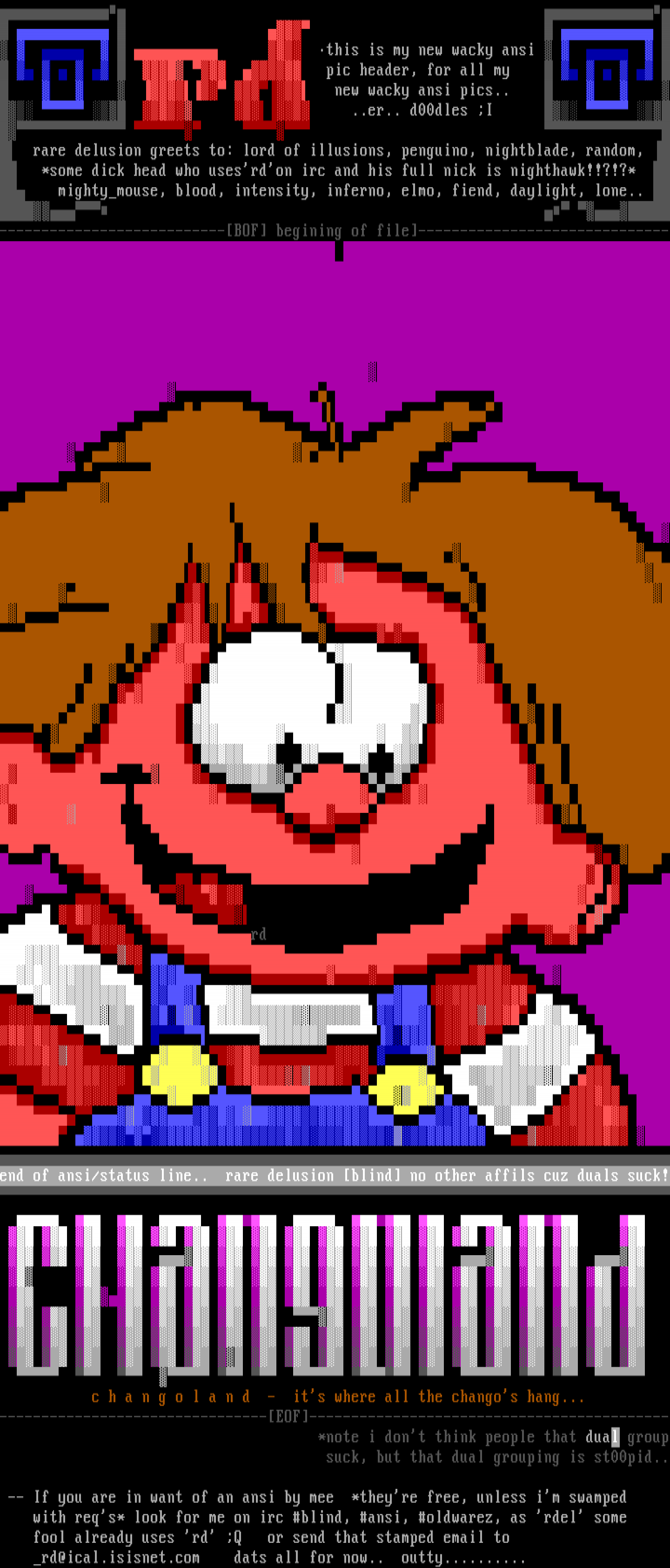 this is my new wacky ansi pic header, for all my new wacky ansi pics.. ..er.. d00dles I rare delusion greets to: lord of illusions, penguino, nightblade, random, *some dick head who usesrdon irc and his full nick is nighthawk!!?!?* mightymouse, blood, intensity, inferno, elmo, fiend, daylight, lone.. ---------------------------BOF begining of file------------------------------
