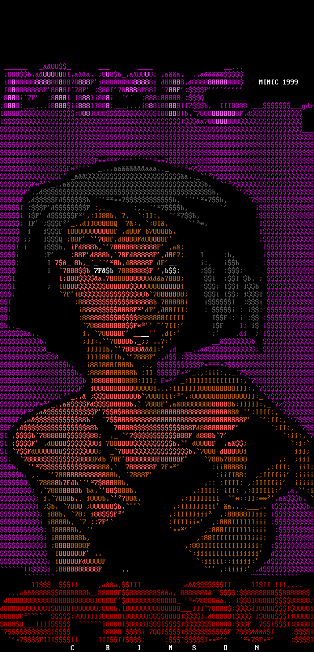 d8888888888888888888888I8888F8888888888888 *78888a,. iI8888888888d88888888888I8888I888888888b,I88888888888888III78888II8888I8888i88888F 788IIII88888I88888I8888II,d88888i I888Ii8888I888QIIII I8888I8888III88888F 7II8888I7I I8888 i 7QQIIF 7I I *7FIIIII IIIII I** *7F* I C R I M S O N