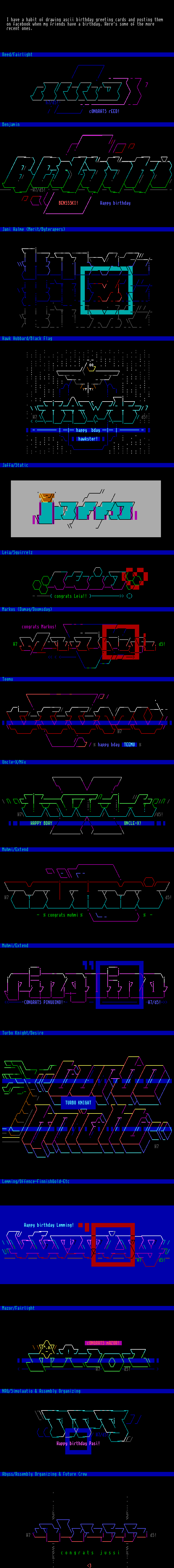 I have a habit of drawing ascii birthday greeting cards and posting them