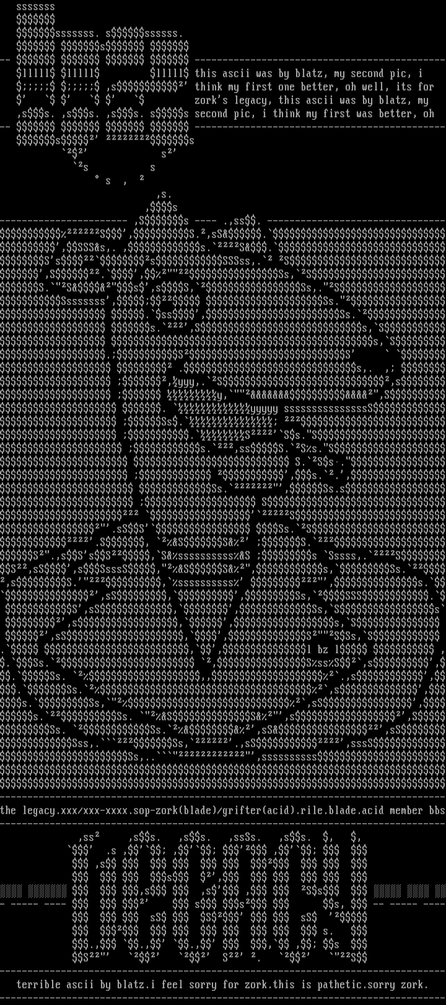 -------------------------------------------------------------------------------- terrible ascii by blatz.i feel sorry for zork.this is pathetic.sorry zork.