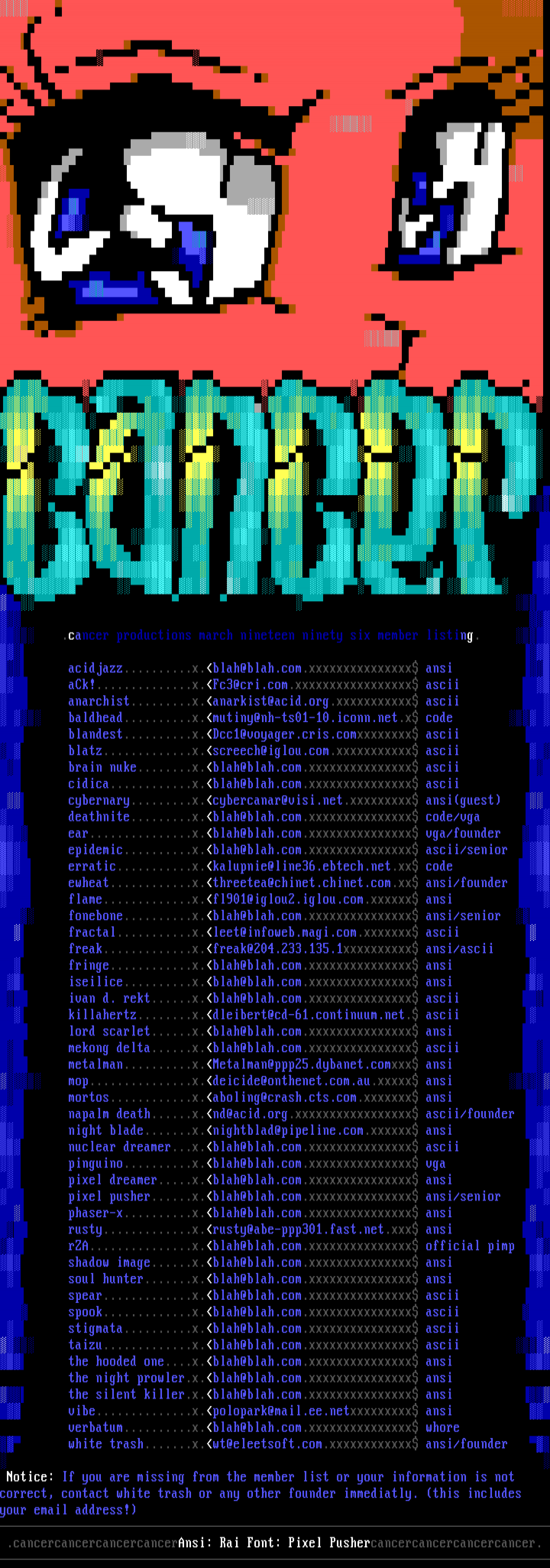 brain nuke........x.blah@blah.com.xxxxxxxxxxxxxxx ascii cidica............x.blah@blah.com.xxxxxxxxxxxxxxx ascii cybernary.........x.cybercanar@visi.net.xxxxxxxxx ansiguest deathnite.........x.blah@blah.com.xxxxxxxxxxxxxxx code/vga